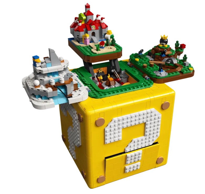 • The ? Block measures over 7 in. (18cm) high, wide and deep, and opens to reveal 4 detailed Super Mario 64™ levels: Peach’s Castle, Bob-omb Battlefield, Cool, Cool Mountain and Lethal Lava Trouble.