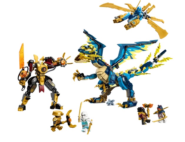 Ninja fans aged 9+ can recreate an epic showdown from the NINJAGO® Dragons Rising TV series with Elemental Dragon vs. The Empress Mech (71796). The building set features fearsome dragon Jiro, who can be upgraded by adding golden blade wings and stud shooters from a flyer vehicle to take on the Empress’s posable golden mech, who is wielding a large sword.